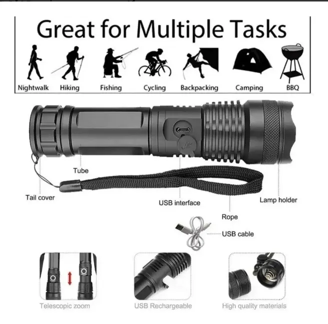 Iluminá cualquier entorno con esta linterna táctica recargable de alta potencia, diseñada para ofrecer rendimiento extremo en situaciones exigentes. Ideal para camping, emergencias, seguridad, trabajo nocturno, uso en el hogar o en el vehículo.