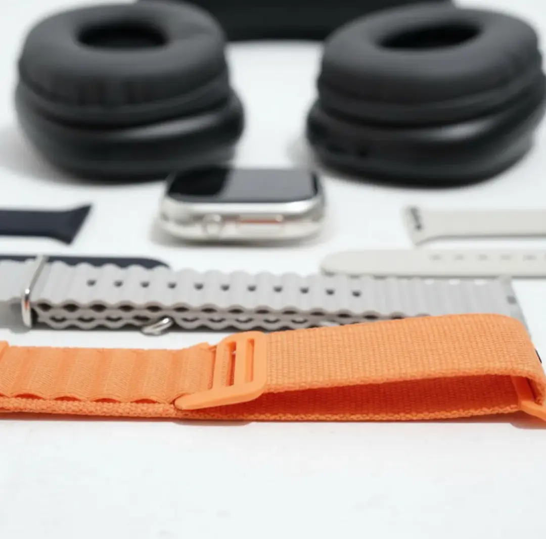 Reloj plateado, auriculares negros y correas en varios colores